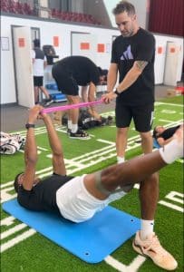 1. Exercício “Dead Bug”: Um exercício intrigante para evitar a extensão da coluna. O transverso do abdômen atua como principal estabilizador, e o reto do abdômen desempenha um papel fundamental em contrações isométricas ou excêntricas, dependendo da amplitude de movimento de braços e pernas e da lordose lombar. Esse exercício requer controle motor, integração e coordenação entre membros superiores e inferiores. É altamente adaptável com várias modificações para se adequar às necessidades do jogador.